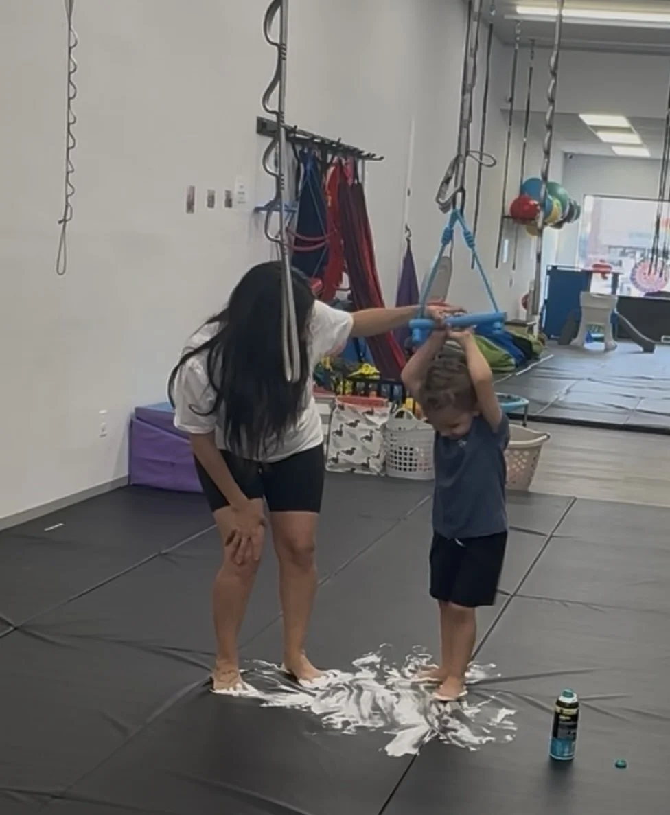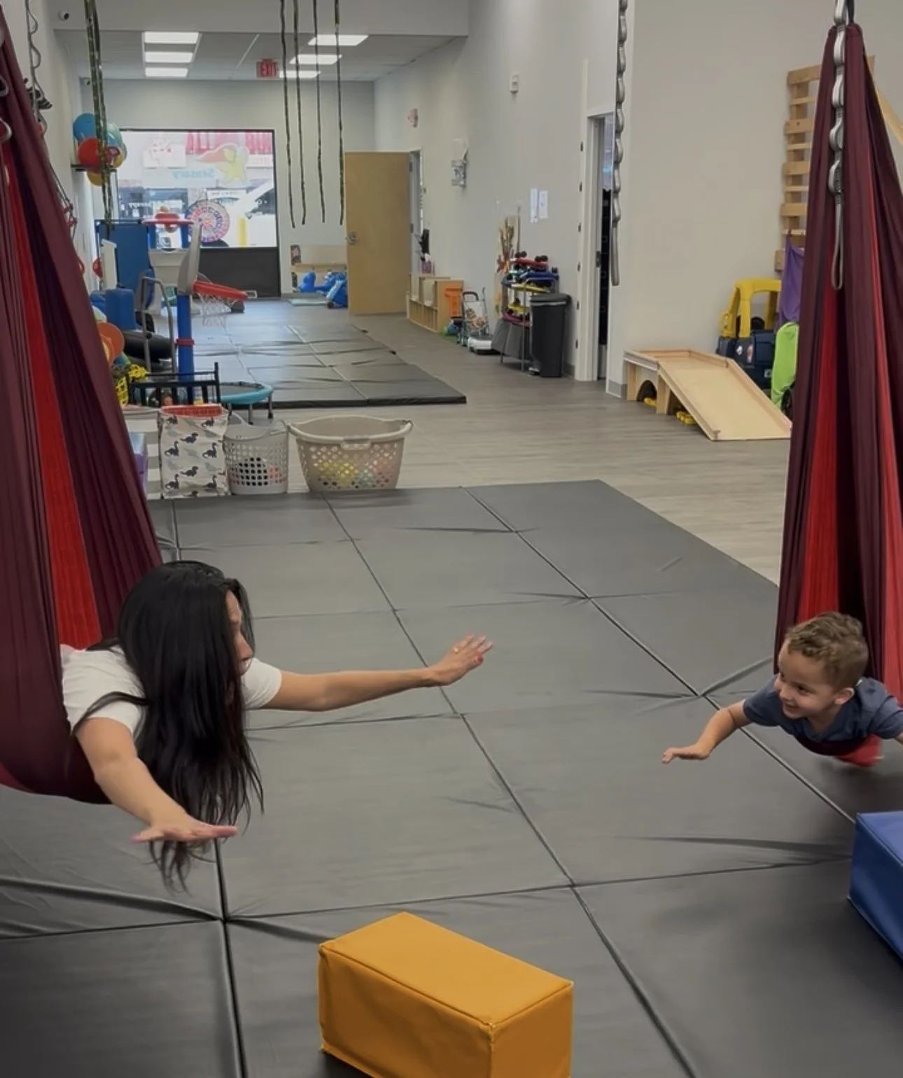 A sensory stars therapist with a client swinging together to knock down colorful blocks. This snapshot captures confidence, connection, and the regulation supports we have that happen every day at Sensory Stars Pediatric Therapy.